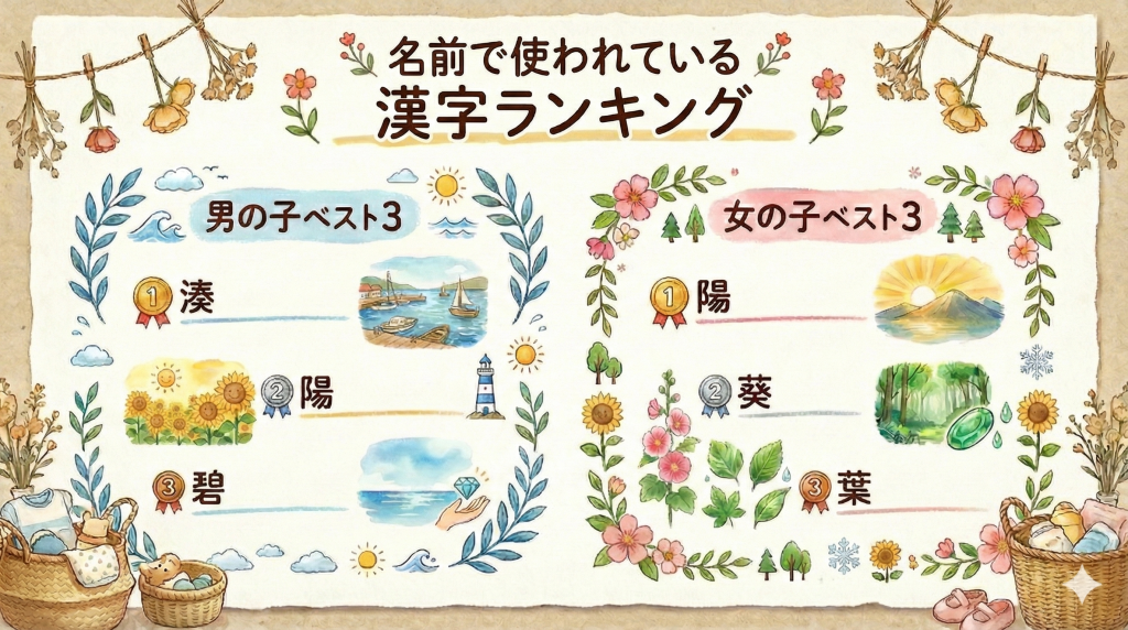 2025年の名前に使われた漢字ランキングでは、自然・光・調和をイメージさせる漢字が上位を占める結果となりました。